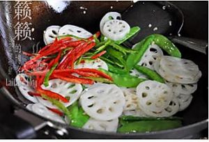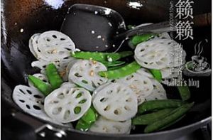 锅里加入少许白糖、精盐,蒜末金黄焦香时,将控水后的藕片及荷兰豆倒入锅中急火快炒10秒钟;