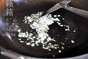 炒锅烧热,注入适量食用油,下花椒粒中小火煸香,将花椒粒捞出扔掉,转大火下蒜末;