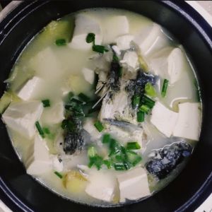 煮3到5分钟,这时候可以闻到一些鱼香味了,汤也有点白了,下豆腐!盖上锅盖继续煮,煮3分钟左右,放盐调味,起锅,放葱花!完成!