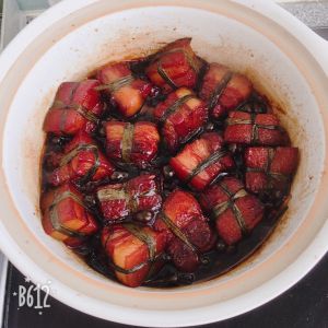 五花肉用粽子叶捆上,放水泡20分钟,控水