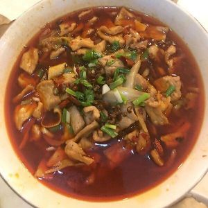这个时候转小火,把腌制好的肉片用筷子夹入汤中,尽量不要让肉粘连在一起哈,肉下完了后转中火煮到肉片变色后再过3分钟捞出~~~不要煮的太久哦!不然不嫩了~肉片捞出。