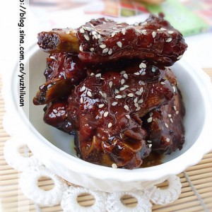 三十分钟后,锅中的汤汁渐少,开大火,熬制汤汁浓稠,见汤汁都裹到排骨上的时候关火,撒上熟的白芝麻,出锅装盘即可。