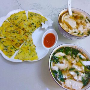 平底锅,热锅少许冷油,倒入面糊,摊平。