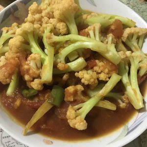 番茄炒到碎后加入菜花翻炒,加少许生抽调色,加少许盐、鸡精,出锅。