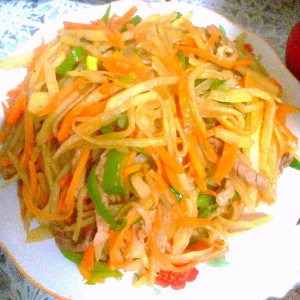 锅烧热倒油,放入姜丝煸炒。放入肉丝煸炒,加黄酒,盐炒熟之后放入土豆丝煸炒两下,放入少许盐,倒入香醋,翻炒两下。再放入胡萝卜丝。接着翻炒,快熟时放入青椒煸炒,青椒熟了,放入葱。即可出锅!