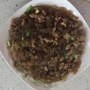 接着就是入锅~倒入适量橄榄油 然后油六分熟的时候放入葱姜蒜 约一分钟后倒入肉丁 然后倒入料酒 待肉六分熟 倒入粉丝 然后加入酱油 盐等调味。最后就是加水煮一会~最后出锅前再次调味即可~可放入味精等,我这道没放 味道也很好哟
