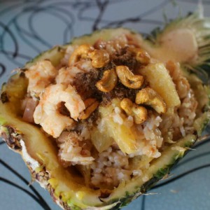 煮好以后在锅里焖个十分钟左右,打开搅匀,盛到菠萝壳里,可以洒点肉松和腰果,享用吧!