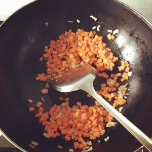 锅中放一小块黄油,将洋葱倒入锅中,煸炒出香味,倒入胡萝卜翻炒至断生后盛出备用