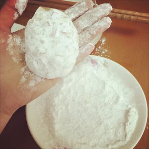 取一小坨土豆泥,搓成团子,拍扁,滚上一层淀粉