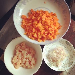 胡萝卜洗净切丁,洋葱切碎