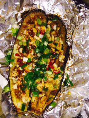 茄子淋上油,酱油置于锡纸上慢烤,烤至5成熟,撒蒜末,烧烤调料(辣椒面,孜然等混合干调料)