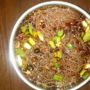 取一个空碗,放入盐,酱油,麻油,香油,鸡精,一勺老干妈,一勺醋