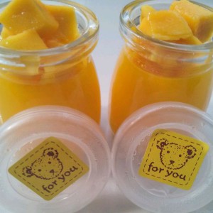 一小时后布丁冷却凝固了,把芒果放在最上面。