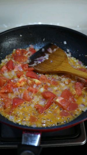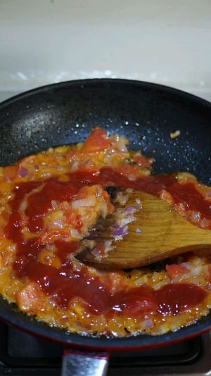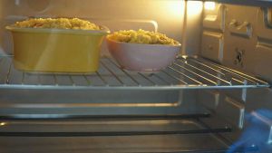 烤箱预热200度,烤碗里盛入米饭,铺上酱汁