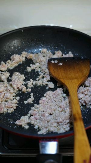 用中火,待黄油融化,把肉沫放进去煸炒,等肉沫颜色变白,盛出备用