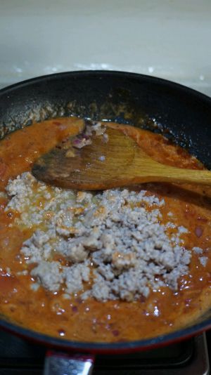 最后放入煸炒好的肉沫,然后加点盐和黑胡椒调味,自己尝一下味道,合适了就关火