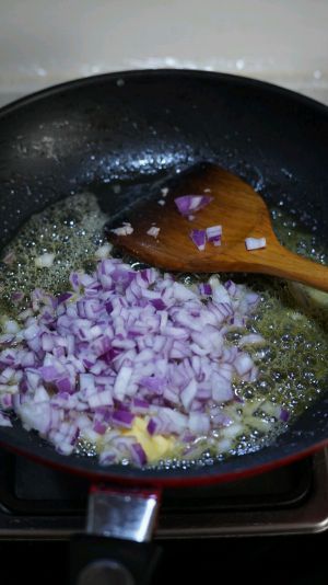 锅里再放一块黄油,然后放入洋葱煸炒出香味