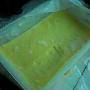 牛奶300g 芒果冰淇淋粉100g放在器皿中用搅拌器搅动20分钟以上