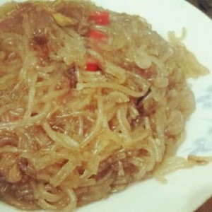 葱姜爆香倒入瘦肉煸炒,用酱油耗油调味,加入粉丝继续翻炒