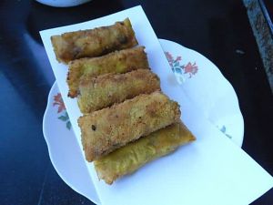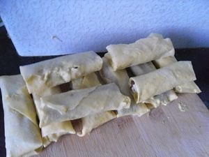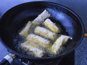 锅烧4分热油,放入春卷,小火慢慢炸制。