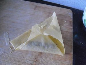 把薄煎饼改刀切成大小适中的形状,做春卷皮。