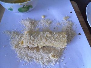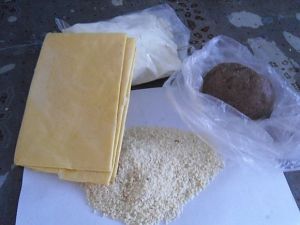 主辅料: 薄煎饼、红豆沙馅、 油、面包糠、调味面粉
