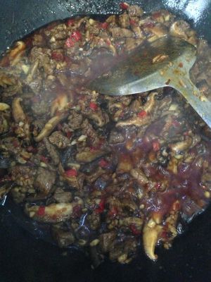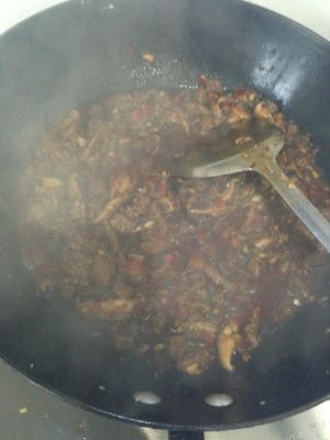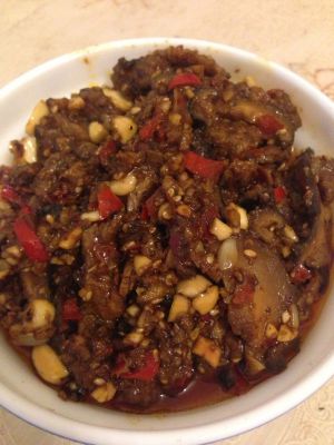 下油锅开炒牛肉,开始要多放油,翻炒至牛肉收紧,加香辣酱(我用的是李锦记的),下香菇姜蒜末炒均匀,最后放花生末芝麻下去翻炒均匀。
