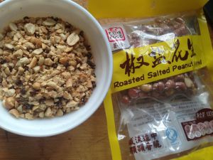 花生去皮炒香,我图省事儿用的包装花生,去红皮就好。还有花椒粒儿,不爱咬花椒的可以用花椒粉或者花椒油代替。袋子装好用擀面杖轻轻碾至半碎即可。芝麻也要稍微炒黄一下出来和花生放一起备用。