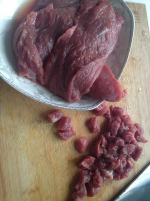 牛肉切丁后下料酒胡椒粉,还有两勺糖腌制。香菇洗净切薄片儿备用(有人喜欢切丁儿而我喜欢片儿 状的)