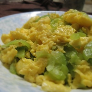 大火热油,下苦瓜片快速炒软,加入鸡蛋块,盐,炒至均匀即
