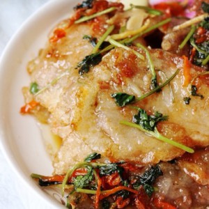 少量油加入锅中,待锅热加入胡萝卜丝姜丝翻炒几下,取适量白砂糖入油锅待糖全部融化将炸好的肉入锅翻炒此时加入蒜、香菜、适量醋,速度要快翻炒几下出锅即可