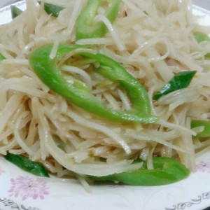 从凉水里捞出土豆丝,放进锅,翻炒一小会。