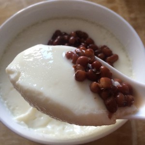 将搅拌好的牛奶过筛后顺着碗边倒入(倒回之前的奶皮碗里);