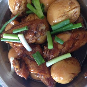 煮十分钟左右,中间汤汁烧,可在少量加可乐,小葱打结,放入慢火收汁。