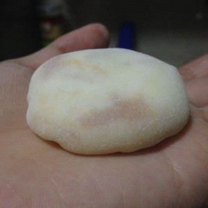 手上摸熟糯米粉,取一部分晾凉面团擀薄。跟饺子皮差不多薄