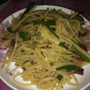 再放入土豆丝翻炒,先放醋翻炒下,后放盐,鸡精。
