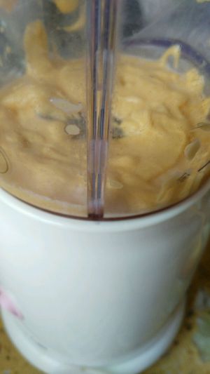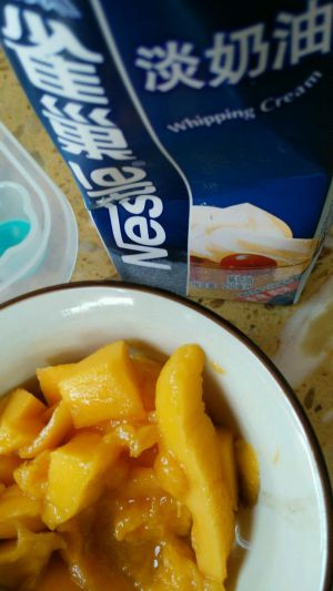 芒果用料理机打碎,倒入容器和淡奶油白糖混合拌匀。