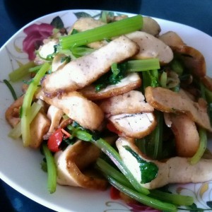 加芹菜炒,加蒸鱼豉油,盐,调味