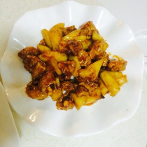 5.锅底放少许油,倒入酱汁,待粘稠时放入肉和菠萝,快速翻炒即可出锅。