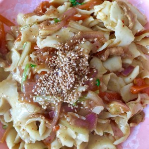 将刀削面倒入翻炒,最后添入辣椒粉、花椒粉、胡椒粉,以及少许生抽,喜欢醋的还可加入少许醋。装盘,撒上点芝麻!