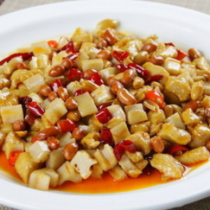 鸡脯肉先拍后斩切成丁,加入料酒1茶匙和少许盐,抓上劲后放入淀粉抓匀,腌制10分钟。