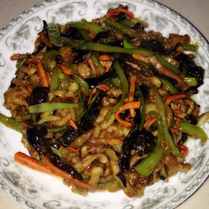 先把肉丝炒熟,再放入木耳胡萝卜 然后再放入辣椒 香菜 翻炒。倒入2号料,炒匀。再倒入1号料。快速翻炒。出锅。