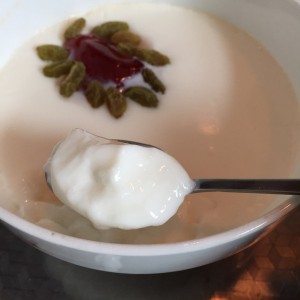 沿碗边倒入奶皮碗中,使奶皮浮起来,盖上保鲜膜再入锅蒸10分钟,关火后焖5分钟