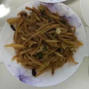 辣椒香味出来后放入过水洗净控干的土豆丝,喷醋翻炒到出现金色时放生抽上色,然后放盐和糖继续翻炒,快全熟时再次喷醋。
