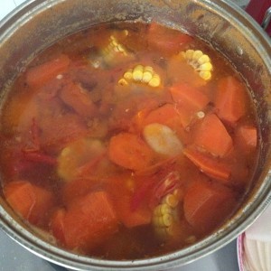 汤锅中的排骨汤煮成乳白色,将胡萝卜,玉米,番茄一起加入排骨汤中,用小火熬40分钟,把胡萝卜和排骨熬烂,加入少许鸡精和胡椒即可!