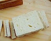 将吐司对切成三角形,也可以用牙签插入固定住。