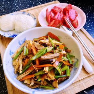 热锅凉油,炒熟五花肉(肉最好腌十分钟)盛出,下葱花姜片爆香,点一品鲜;下入芹菜和胡萝卜炒透,再下腐竹和香菇翻炒均匀;入耗油加生抽继续翻炒,倒入老汤或者开水少量,轻炖一小会加盐和糖;最后收汤汁,再用水淀粉勾芡:关火,出锅前少淋点香油即可。盛盘要用勺子一勺勺盛出,切记不要用锅倒入盘里。