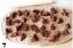 按扁排气,滚圆松弛15分钟,再次按扁,擀成1cm厚的长形面片。把200g巧克力蛋糕分割成块状,均匀的铺在面片上