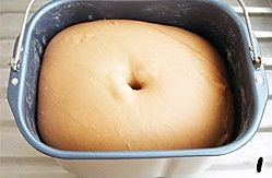 高筋粉300g、可可粉15g、温水180g,黄油20g,白糖20g,盐3g,酵母粉3g,揉成光滑可以拉成薄膜的面团,发酵到两倍大