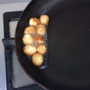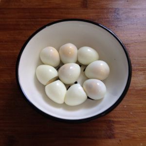在锅中倒入植物油将鹌鹑蛋的外皮煎出皱皱巴巴、浅棕色的外皮